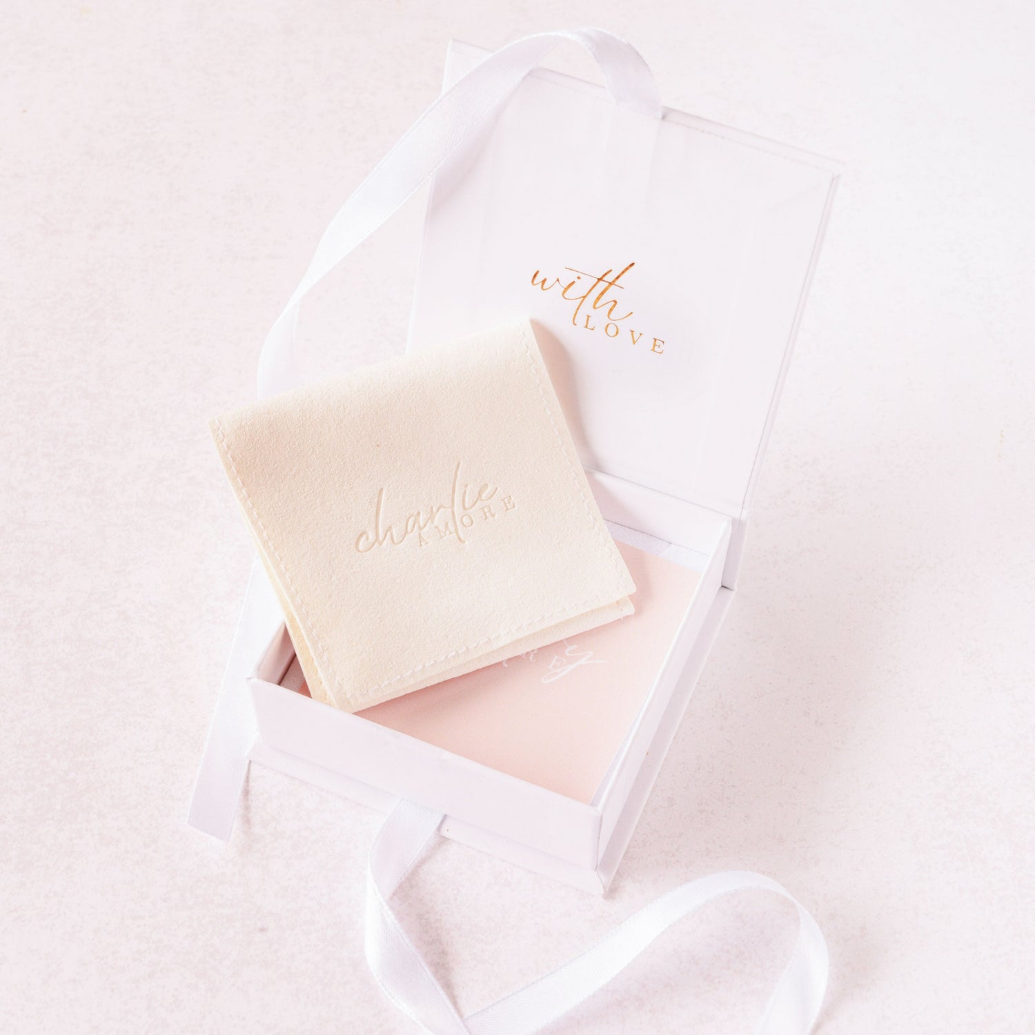 Each order is lovingly packed in our signature white and gold magnetic closing jewelry boxes with our branded microfiber pouch and delicate ribbon bow!